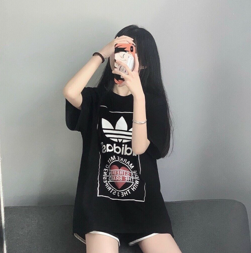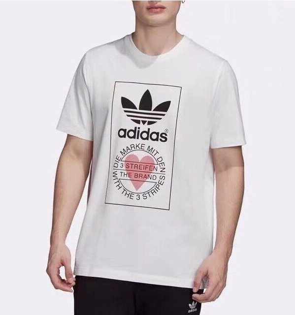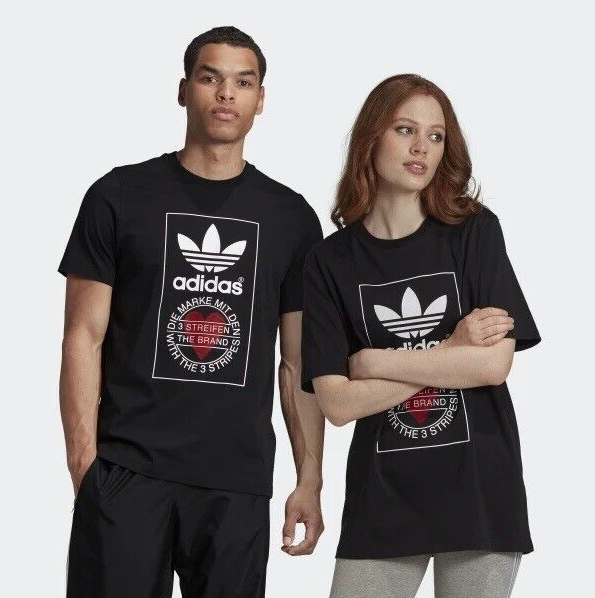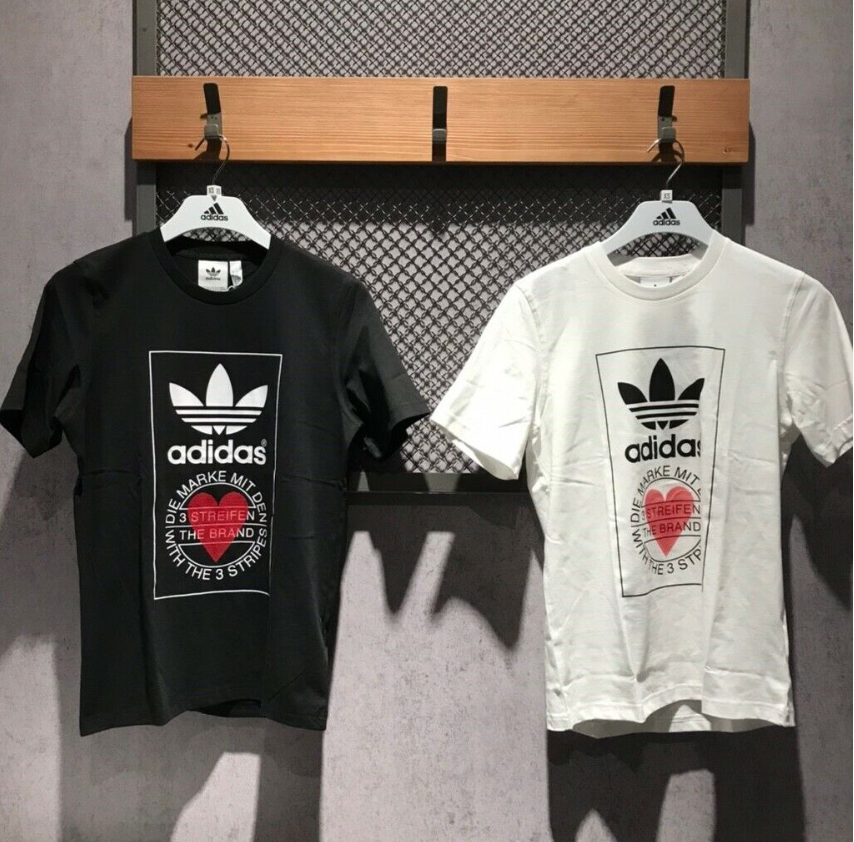 Made from 100% cotton featuring a ribbed neckline, short sleeves and unique heart print added onto Adidas's originals classic logo. This unisex shirt is oversized in fitting and long in length for women, regular fit for men.It is perfect for active wear, or for a casual look.