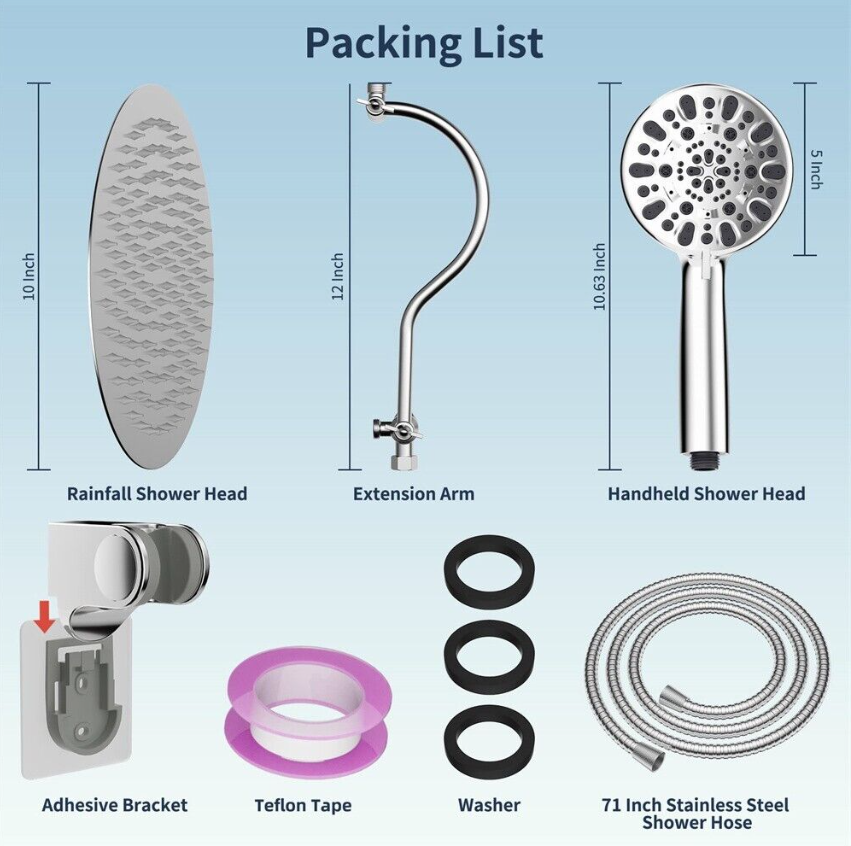 • Excellent Shower Head Combo: This hand shower combination comes with 10 inch large round rainfall shower head, chrome face 7-Spray settings handheld shower head, 71 inch metal stainless steel shower hose, 12 inch shower head extension arm, adhesive shower head holder, washer, teflon tape, and installation manual. All metal solid Brass stainless steel extra long 71 inch shower hose is made of odorless EPDM material that can be used in high pressure and high temperature environment.