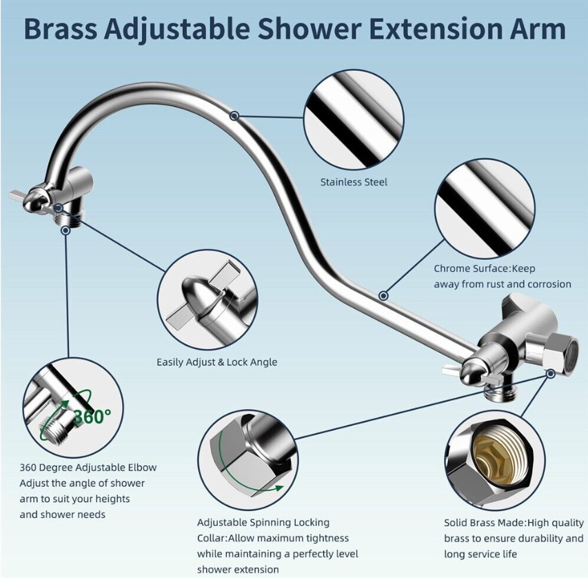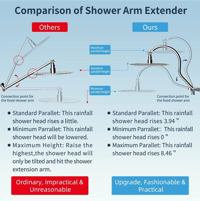 • 12'' Upgrade Adjustable Shower Extension Arm: Height & angle adjustable curved shower head arm extension fits any rain shower head or handheld shower head, height can be adjusted up and down, shower head is always vertical in your large size and will not hit the shower arm, instead of sloping water like ordinary straight shower arms. Curved shape design enhances its bearing capacity, high rise your shower head, and can achieve vertical water.