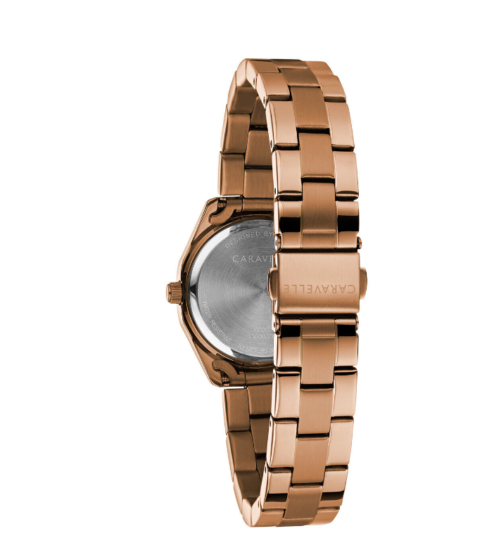 | Perfectly petite and romantic. In stainless steel with rose-gold finish, the 48 individually hand-set crystals with patterned rose-gold dial sets the standard for an updated classic look. Additional features include calendar, second hand, and double-press fold-over clasp. Case Diameter: 28 mm Case Thickness: 8.8 mm Water Resistance: 30M 3-year Limited Warranty | |
