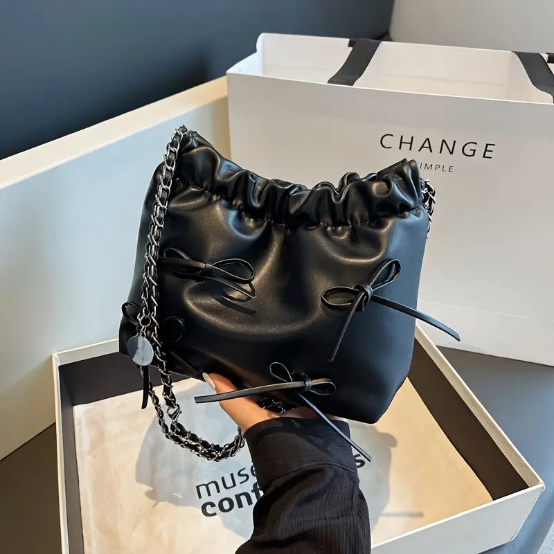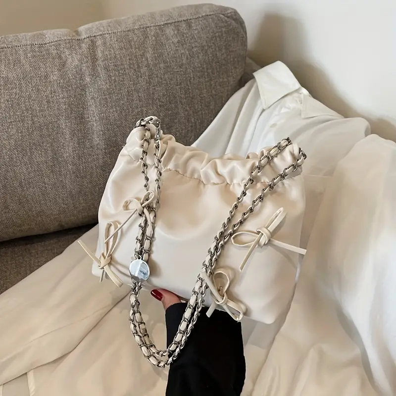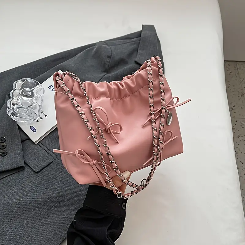 Cute Bow Decorated Shoulder Bag, Solid Color Pleated Crossbody Bag, Perfect Underarm Bag For Daily Use