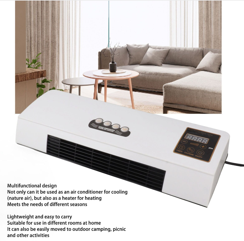1. Multifunctional Design: Not only can it be used as an air conditioner to cool down (nature air), but also can be used as a heater to heat up, 3 seconds fast heat up, instantly turn on and heat up, to meet the needs of different seasons.Specification: