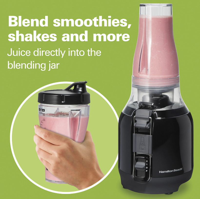 Juicing and blending go hand-in-hand as part of a healthy lifestyle, and now you can juice and blend with one space-saving appliance. Thanks to its versatile 2-in-1 design, the Hamilton Beach Big Mouth® Juice & Blend 2-in-1 Juicer and Blender makes fresh juice from whole fruits and vegetables, which you can add to all your favorite blended recipes. You’ll save time as you juice because the 3" Big Mouth® chute fits whole produce, and by replacing the juice extractor attachment with the 20 oz. blender jar, you can juice directly into it — no need to transfer juice from one container to another. With this versatile 2-in-1 appliance, you can go from making simple juice to creating a wide variety of flavorful smoothies, shakes, cocktails or slushies. You'll easily power through tough ingredients like hard produce and ice with its 800 watt, 2 speed motor and pulse. Amp up your nutrition and add more flavor to your life today — recipes are included to get you started. Includes patented Easy Sweep™ cleaning tool and removable, dishwasher safe parts for easy cleanup. Backed by Hamilton Beach, the #1 brand in juice extractors