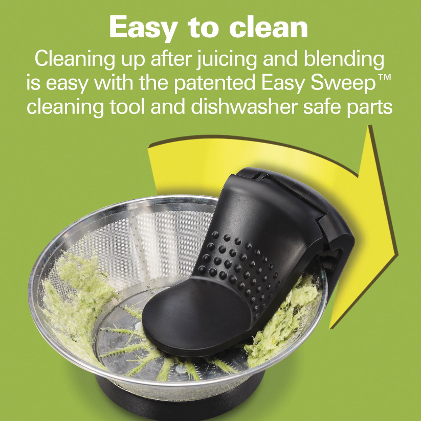 • EASY TO CLEAN: Cleaning up after juicing and blending is easy with the patented Easy Sweep™ cleaning tool — it cuts strainer cleaning time in half. To finish the job, just put the tool and all the removable parts in the dishwasher for easy cleanup.