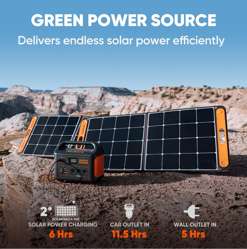 Clean and Unlimited Solar Energy: 100% green energy with smart MPPT controller for optimal charging efficiency. The power station can be fully charged with 2 Jackery SolarSaga 100W solar panels (Should be bought separately) within 6 hrs or only 5.5 hrs via AC wall outlet charging. Ideal for your camping or family emergency storage.