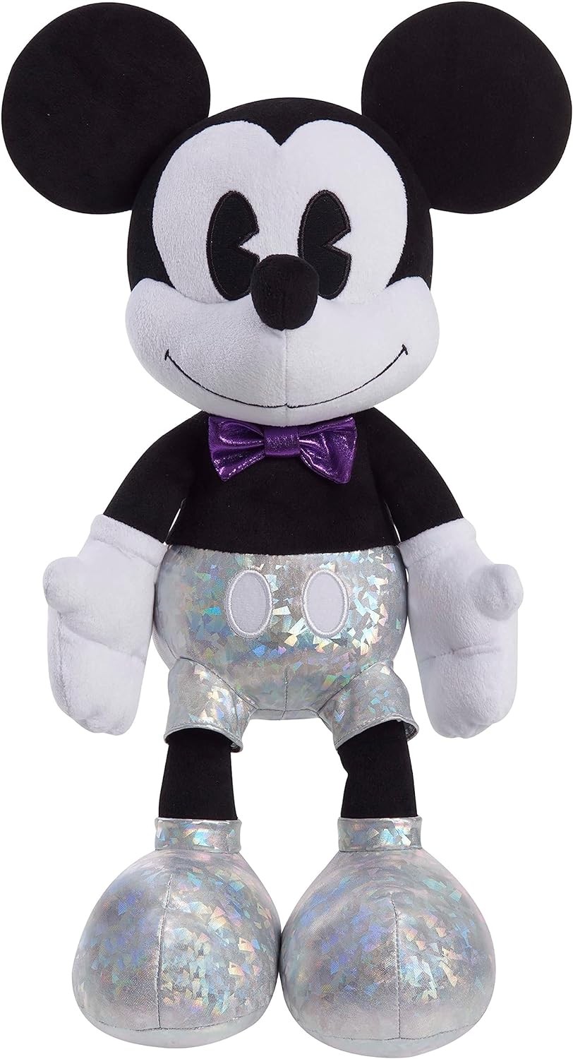 Celebrate a lifetime of memories with the Disney100 Years of Wonder Mickey Mouse Large Plush. This collection honors a century of magical storytelling by the Walt Disney Company. Mickey Mouse first appeared on the silver screen in 1928. He comes well prepared for the celebration in his stylish, platinum best from the top of his ears his special Disney100 Years of Wonder foot badge. This 19-inch tall, cuddly plush comes dressed in his shimmery purple bowtie, holographic shorts, signature white gloves, and features classic embroidered detailing. Mickey Mouse, along with the Minnie Mouse, Stitch, and Jack Skellington Disney100 Years of Wonder Large Plush, make a fantastic addition to any movie fan’s stuffed animal collection (each sold separately). These once-in-a-lifetime keepsakes are ideal for fans and kids ages 2 years and up.