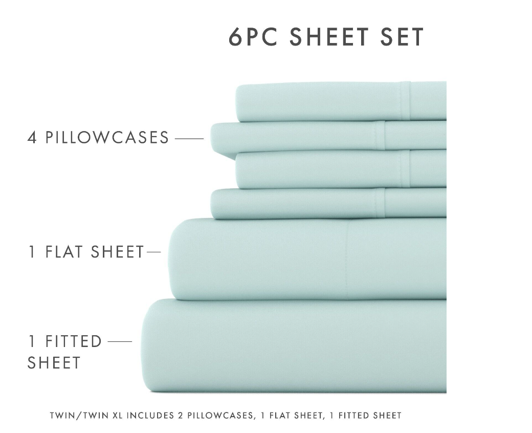 • Package Includes: 6 piece set includes 1 Flat Sheet, 1 Fitted Sheet, and 4 Pillowcases (Twin and Twin Extra Long sets come with 2 Pillowcases) .
