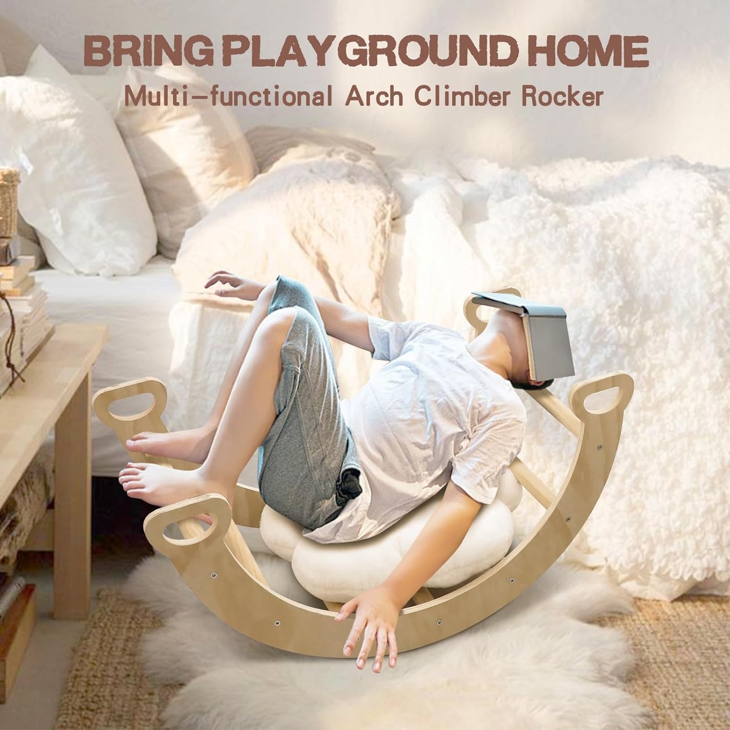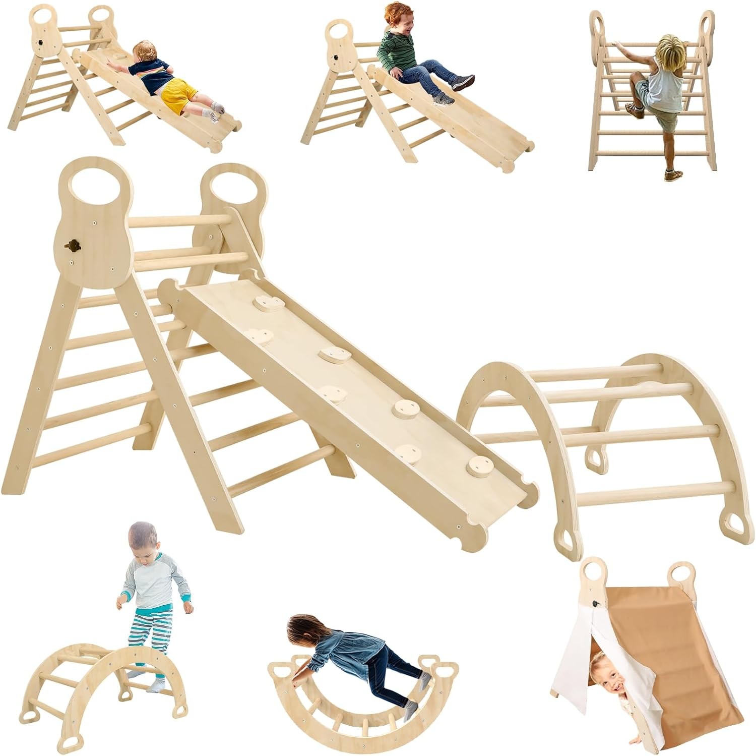 • 【7-in-1 Montessori Toddler Climbing Toys Indoor】The toddler climbing play set includes a pikler triangle, a climbing arch, and a double sided reversible thick board (climbing and slide) . Each section is a separate climbing unit, providing endless possibilities for combining them in different ways. In addition, the Triangle Ladder has multiple locking positions so you can adjust the incline as you climb or slide.