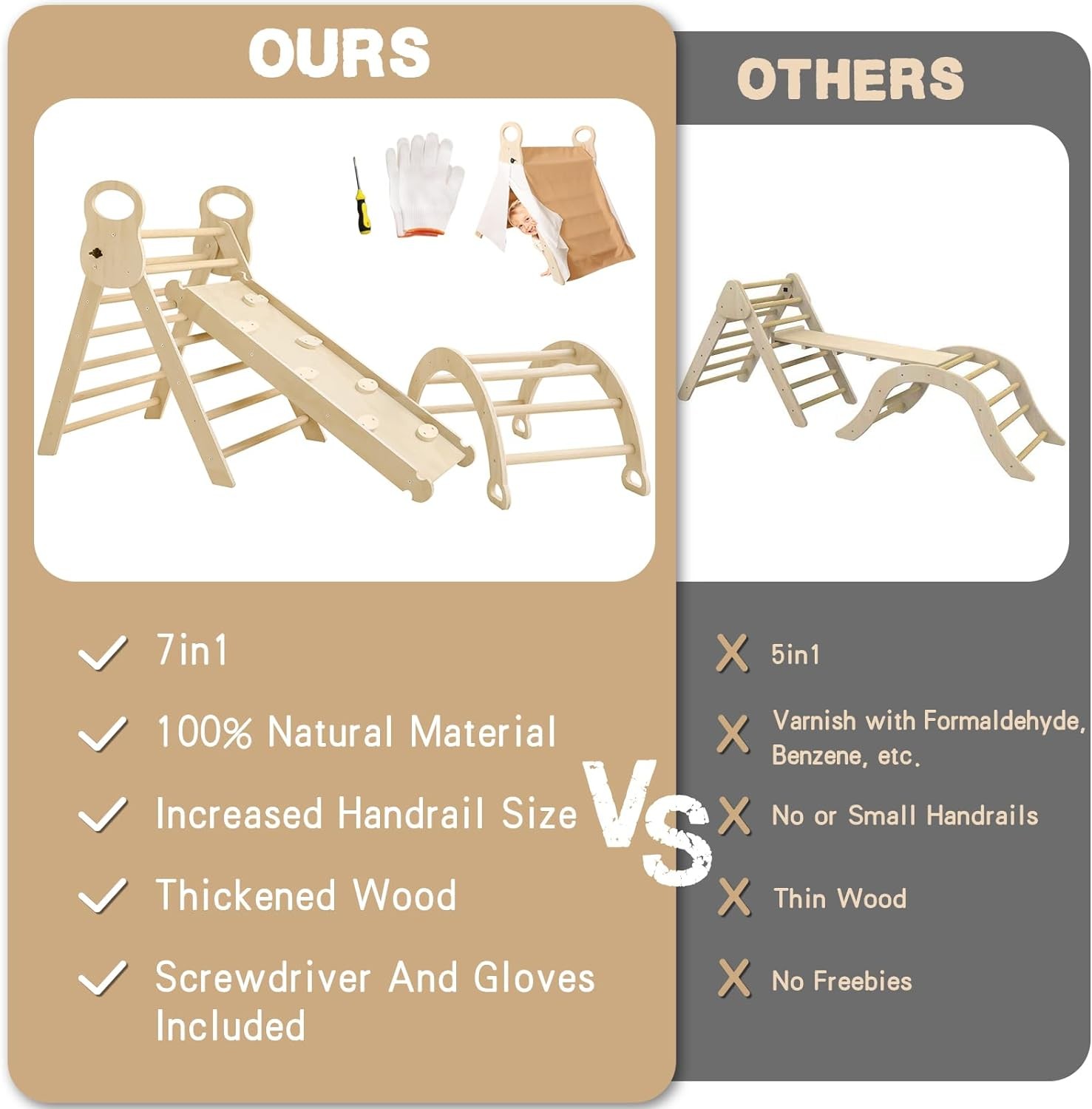 • 7 in 1 Pikler Triangle Set, each section is a separate climbing unit, providing endless possibilities for combining them in different ways.