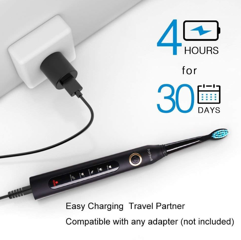 • 4 HOURS CHARGE FOR MINIMUM 30 DAYS USE. 2 minutes smart timer with interval pause reminding each 30 seconds to encourage dentist-recommended brushing habit. Waterproof to be used at bath and shower. Long battery life convenient for a business trip.
