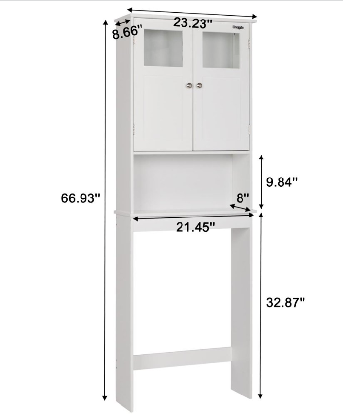 Introductions: This is a simple and modern style wall-mounted standing bathroom cabinet. Adopting high quality and hard MDF sheet, it is waterproof and moisture-proof. Double-door and three-layer design can help you classify your items better. You can put a variety of toiletries, cosmetics, and other sundries. In addition, the middle board in the double door can be movable and can be adjusted up and down according to your wishes. The space between below two feet is special to reserve for closes tool, which saves the floor area of the bathroom greatly and provides a perfect design plan for your bathroom. Specifications: Brand: FCH Material: MDF Color: White Chrome handle Dimensions: (23.23 x 8.66 x 66.93)" / (59 x 22 x 170)cm (L x W x H) Door's Interior Overall Dimensions: (21.46 x 7.09 x 22.44)" / (54.5 x 18 x 57)cm (L x W x H) In-between Layer Dimensions: (21.46 x 8.07 x 9.84)" / (54.5 x 20.5 x 25)cm (L x W x H) Size Between Legs: (21.46 x 8.07 x 30.31)" / (54.5 x 20.5 x 77)cm (L x W x H) Door Dimensions: (10.63 x 22.44)" / (27 x 57)cm (L x W ) Weight: 32.63 lbs / 14.8kg